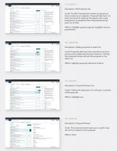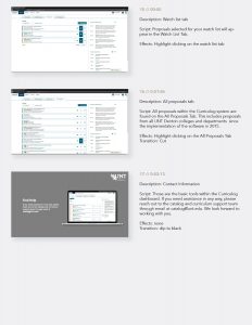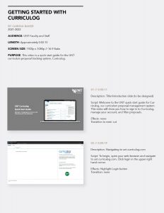 Armed with the user feedback, I created a storyboard in InDesign for a quick start video. For content, I began with the basics of logging in and immediately instructed users on how to change their email settings. From there, I walked through each section of the Curriculog dashboard, including how to interact with each tab and proposal links. The technical aspects included maintaining a 1920x1080px screen format. In keeping with “quick,” I limited the video to approximately 2 minutes and 15 seconds.