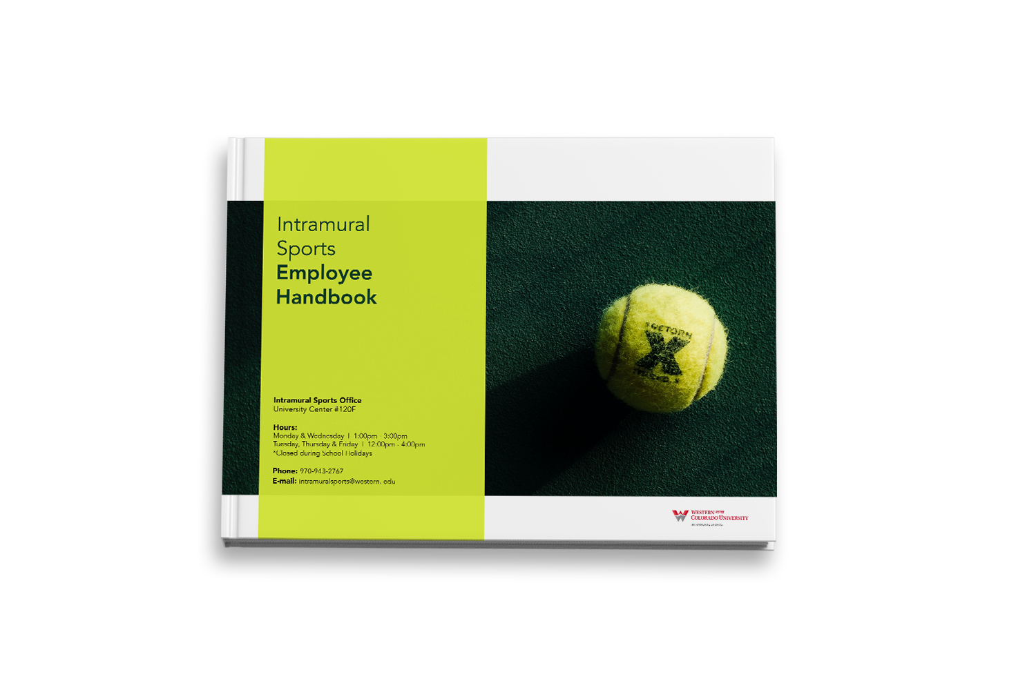 The Intramural Sports Employee Handbook for Western State Colorado University began as a complex and poorly designed Word document. The handbook included page borders, misaligned forms and formatting, heavy centering, and inappropriate highlighting, capitalization and underlining.